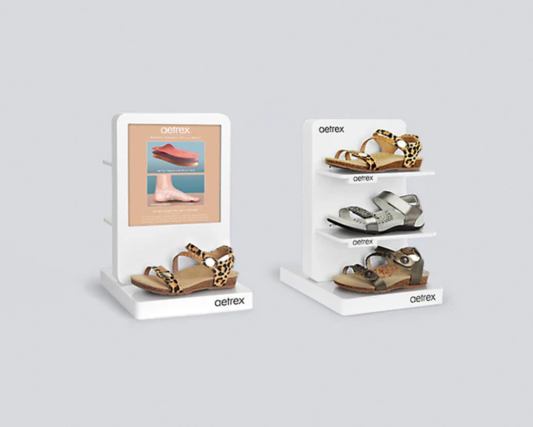 Enhance your retail space with our double-sided tabletop display, designed to showcase four Aetrex footwear styles in a sleek and organized manner. This display also features a footwear technology graphic, providing customers with insights into the Aetrex Difference.